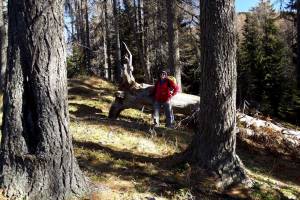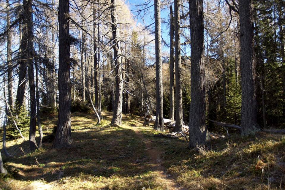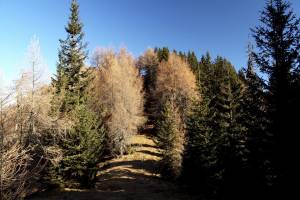 Ker nam že dvakrat ni uspelo priti na Vošco, sem šel tokrat en teden pred pohodom pogledat, če so les s poti že odstranili. Niti sledu o kakšnih skladovnicah ni bilo, šel sem sam, s svojo psičko Dino in doživel en čudovit jesenski pohod med zlatimi macesni.