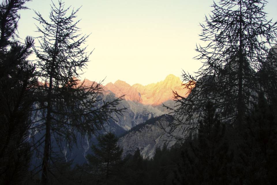 S Koče na gozdu smo strmeli proti vrhovom, katerih se še ni dotaknilo sonce, in ugibali, le kateri je naš. Bili smo še precej jutranji. Redkobesedni smo »oblačili« varovalne pasove in preverjali ostalo opremo. Mislim, da so prvi »oživeli« fotografi; no, Milena, ki je že veselo škljocala in beležila trenutke, ki bodo postali naši spomini.