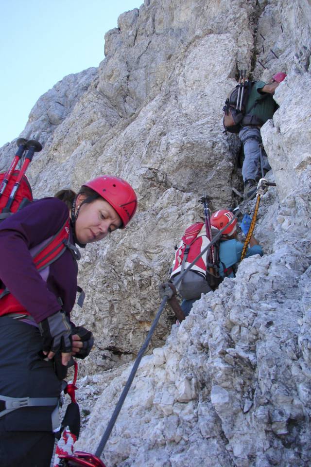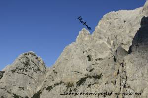 Med tem se je sončna svetloba že sramežljivo dotaknila prvih skal, nebo je počasi postajalo vedno bolj modro in razgledi, ki smo jih srkali vase, so obljubljali krasen dan. Z vsakim korakom smo bili bližje vstopu v steno, kjer smo se dokončno opremili. Avantura se lahko začne!