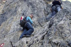 Hanzova pot na Prisojnik ali Prisank, kot ga ljubeče imenujejo domačini, je res krasna in nudi obilo užitkov. Pravzaprav ima vse; od položnih melišč, navpičnih (a dobro zavarovanih) sten, do sten, ki smo jih splezali prosto, do travniških zaplatic, ki so nas presenetile za naslednjim ovinkom in seveda ima prekrasne razglede na vršiško stran in na vrhu skoraj na cel svet! Dan je bil pravzaprav vroč za tako pozen datum in bili smo zelo zadovoljni, da je skoraj cel vzpon potekal po senčni strani.