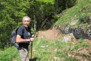 Vrh Bače - 1273m - je razgledno sedlo med Primorsko in Gorenjsko. Na južni strani sedla, se nahaja prijetna lovska koča, od katere se nam odpre lep razgled na Porezen in Baško grapo pod njim. V bližini lovske koče, pa se nahaja tudi kar nekaj zanimivih vojaških bunkerjev in kasarn, ki so jih zgradili Italijani med obema svetovnima vojnama. V nedeljo, 15.maja 2022 ob 8.00 smo se odpeljali na Petrovo Brdo. Trije planinci in tri planinke smo se podali na pot v smeri Črne prsti. Pol ure strmega kolovoza smo uspešno predihali. Naredil se je topel sončen dan brez oblačka. Hodili smo po gozdu komaj ozelenelih bukev. V križiščih smo zavijali v smer Črna prsti. Pot se je položila in nas pripeljala na staro, a odlično ohranjeno mulatjero. Vzpon nadaljujemo po omenjeni mulatjeri. Kmalu nam padlo drevo naredi malo težav, da ga obhodimo. Mulatjera nas skozi gozd in nekaj grap pripelje do hišice, ki je Lovčev bivak Pri Koucah -1192m. Hišic je več, pa vrt, kurišče, klopi in mize, vrtiček, razgledni stolp, kozolček, stranišče in verjetno še kaj. Vzeli smo si čas za počitek in uživanje. Tu se pot razdeli na Lajnar ali naprej na Črno prst. Od Lovčevega bivaka nadaljujemo po markirani poti v smeri Črne prsti. Poti je dobro uhojena, ne da se izgubiti, a markacij ni več. Le zelo stare markacije so na kakšni skali. Pot naprej položno preči pas gozda, nato pa postopoma preide na vse bolj razgledna pobočja, s katerih se nam odpira razgled v Baško grapo in gore naokoli. Ob poti v skalovju nas razveseli cvetoči avrikelj. Ko se pot rahlo spusti smo že na cilju – lovska koča v sedlu. Z zanimanjem pregledamo kasarno ob poti. Še bolj pa nas pritegne balkon in line bunkerja visoko v skalovju. Po označeni, a ozki stezici, smo vse tri planinke dosegle vhod v bunker in si bunker odznotraj ogledale. Čudile smo se zidu – gladek, nepopokan, ne vlažen. Kar težko verjamemo, da je star 100 let, zgrajen po določitvi Rapalske meje. Pri lovski koči smo pomalicali in se po isti poti vrnili na Petrovo Brdo. Izlet je bil čudovit in nezahteven. Hodili in počivali smo 4 ure, naredili 10km in malo več kot 500 višinskih metrov. Ali vi to zmorete? Seveda. Zato,…. Prihodnjič povabljeni z nami. Izleta smo se udeležili: Eli, Majda, Mojca, Franček, Boro in Marjan.
