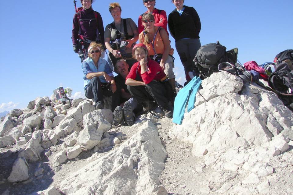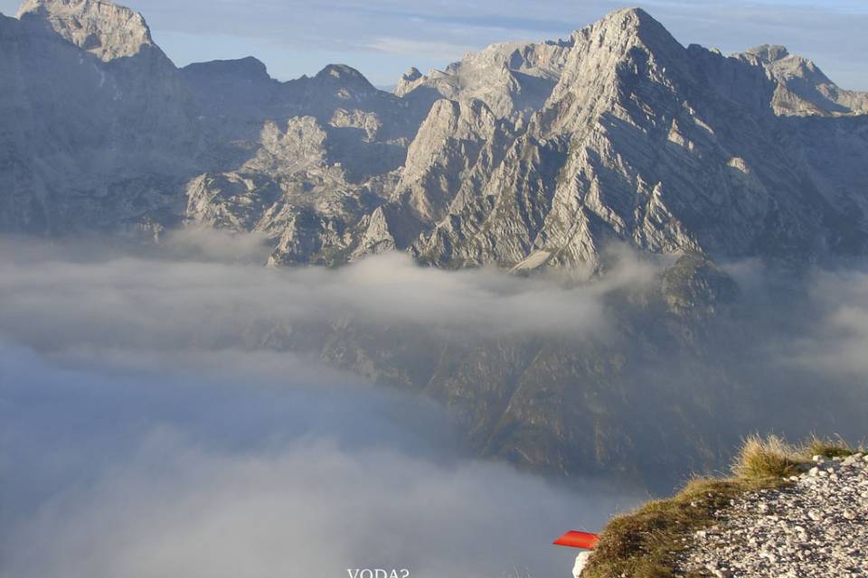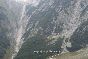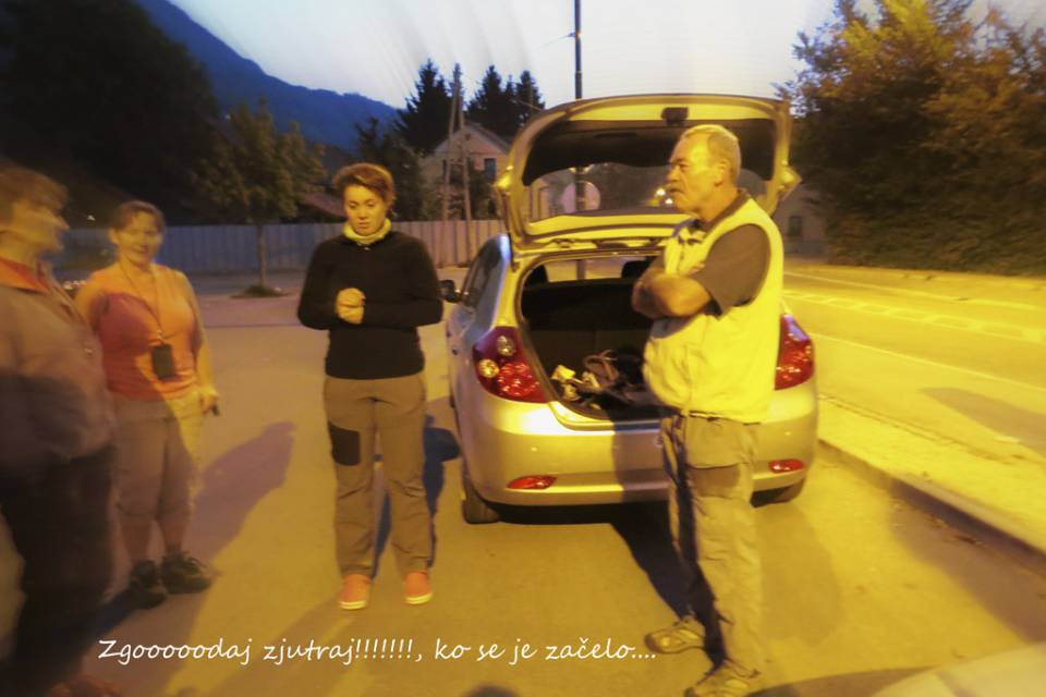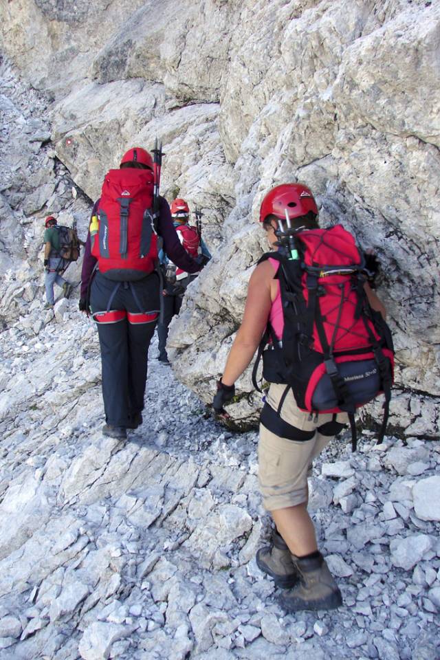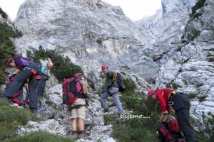 Polni pričakovanj smo se še v svežem jutru odpravili na pot proti Prisojniku. Hanzova pot je bila popravljena in ponovno odprta. S Koče na gozdu smo strmeli proti vrhovom, katerih se še ni dotaknilo sonce, in ugibali, le kateri je naš. Bili smo še precej jutranji. Redkobesedni smo »oblačili« varovalne pasove in preverjali ostalo opremo. Mislim, da so prvi »oživeli« fotografi; no, Milena, ki je že veselo škljocala in beležila trenutke, ki bodo postali naši spomini.