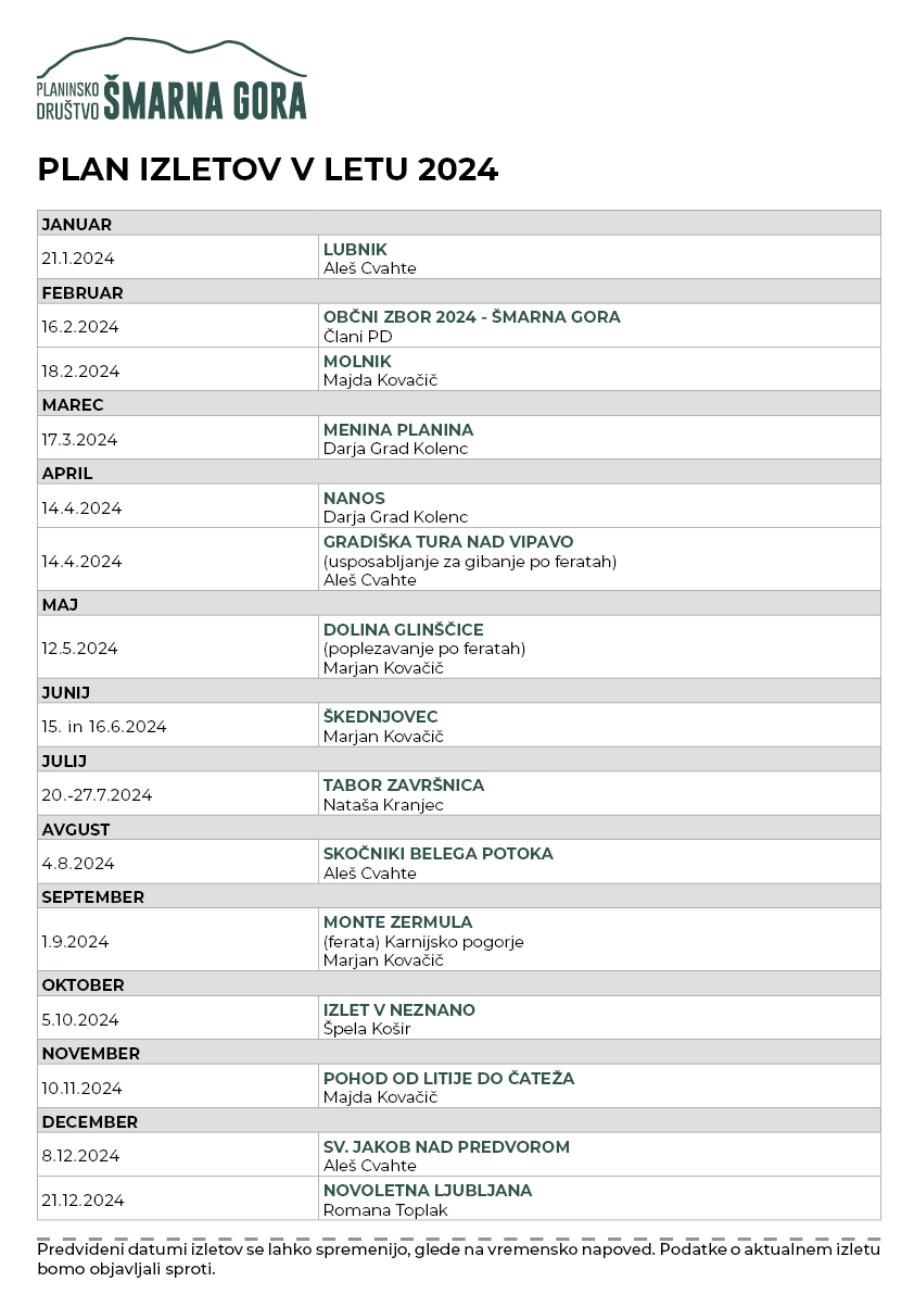 Objavljamo seznam izletov 2024! Vabljeni, da se nam pridružite.