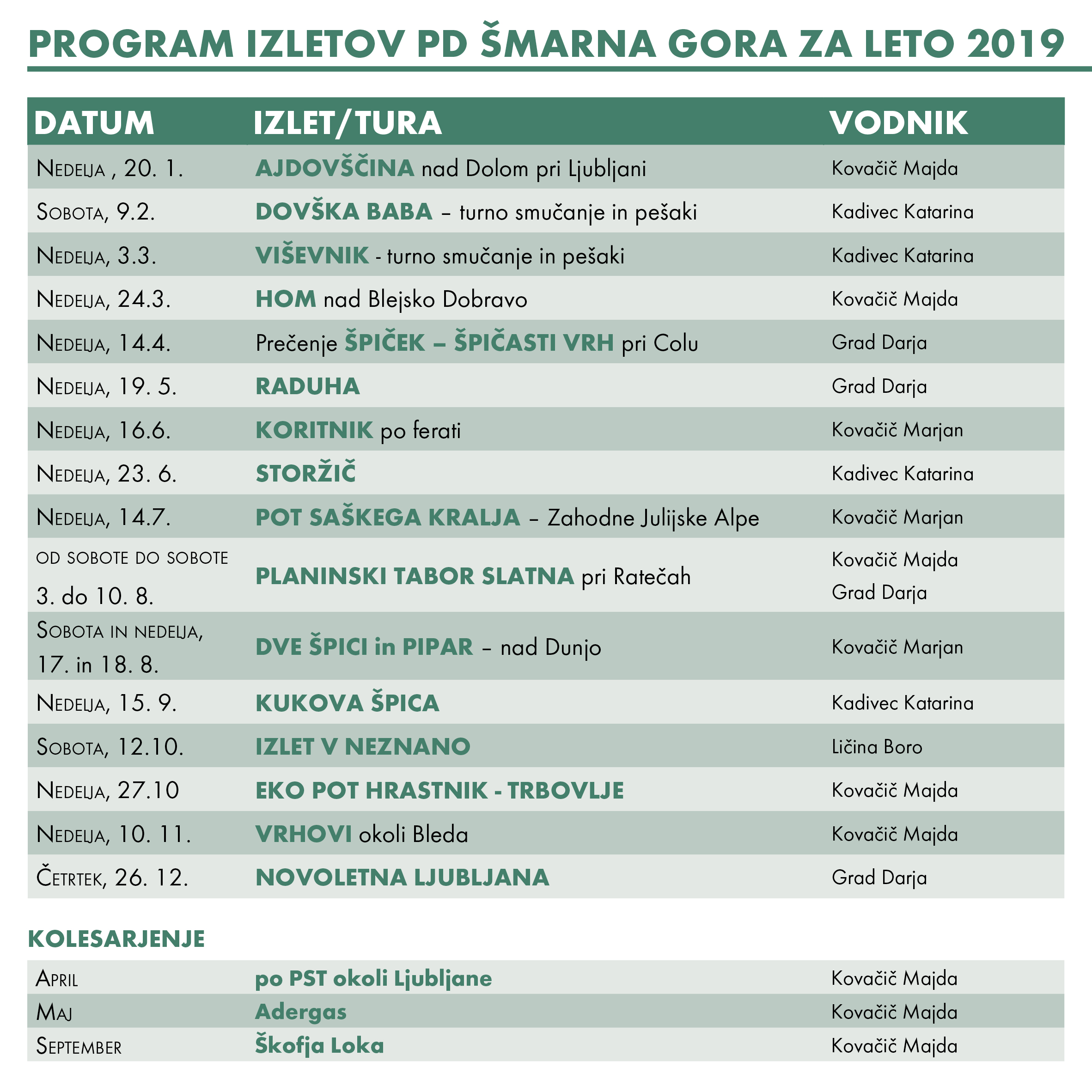 V tabeli smo zbrali vse izlete, ki jih načrtujemo v letošnjem letu.